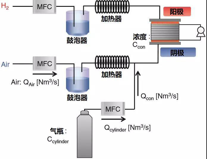 如上圖所示,10片Clarity燃料電池單體串聯(lián)組成的電堆為實驗觀察對象。高純氫氣通過鼓泡器加濕和加熱至車載燃料電池相同工況下進入電堆;干凈空氣經(jīng)加熱和加濕后與來自T型連接結構的雜質(zhì)混合至指定濃度后進入電堆。采用KOFLOC Model 3660 SERIES質(zhì)量流量控制器對氣瓶中的雜質(zhì)氣體流量控制以達到穩(wěn)定的濃度。