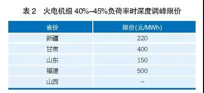 限價是火電企業(yè)最為關(guān)注的市場規(guī)則之一。以火電機組40%-45%負荷率為例,各省限價如表2所示,該負荷率下山東市場的限價最低,而福建市場限價最高。需要特別說明的是,山西未對報價進行上限控制,因為山西深度調(diào)峰交易采用雙向報價、集中競爭、滾動出清、統(tǒng)一價格結(jié)算的方式組織,當(dāng)可再生能源發(fā)電機組邊際價格小于火電邊際價格時,認(rèn)為交易未達成,不調(diào)用深度調(diào)峰。