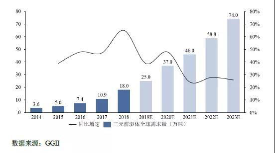 事實上,根據(jù)GGII調(diào)研數(shù)據(jù),近年來,三元前驅(qū)體市場需求高速增長。2018年全球三元前驅(qū)體需求量為18萬噸,同比增長超60%,預(yù)計到2023年,全球三元前驅(qū)體需求量將達(dá)到74萬噸。全球三元前驅(qū)體需求變化情況如下圖所示:
