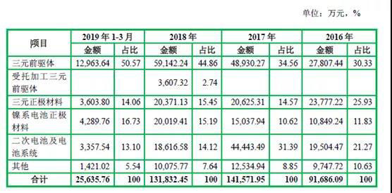 從營收結(jié)構(gòu)看,科隆新能源營業(yè)收入主要來自電池正極材料及電池產(chǎn)品,合計銷售收入比重均在90%以上,其中三元前軀體占比逐年提升。