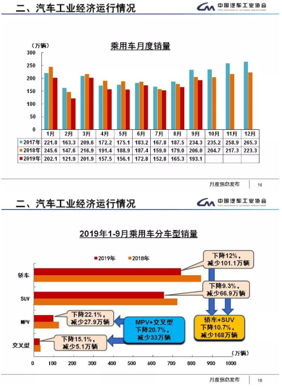 中汽協(xié)公布的數(shù)據(jù)顯示,9月,汽車產(chǎn)銷量分別為220.9萬(wàn)輛和227.1萬(wàn)輛,比上月分別增長(zhǎng)11%和16%,比上年同期分別下降6.2%和5.2%,產(chǎn)量降幅比上月擴(kuò)大5.7個(gè)百分點(diǎn),銷量降幅比上月縮小1.7個(gè)百分點(diǎn)。9月汽車銷量同比降幅收窄,1-9月的降幅也比1-8月收窄0.7個(gè)百分點(diǎn)。1-9月,汽車產(chǎn)銷分別完成1814.9萬(wàn)輛和1837.1萬(wàn)輛,產(chǎn)銷量比上年同期分別下降11.4%和10.3%。