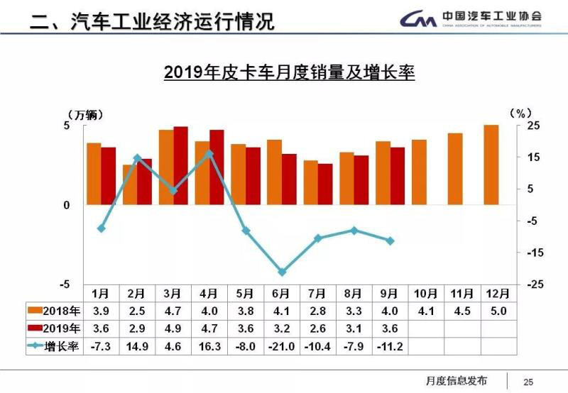 值得關(guān)注的是,1-9月,皮卡車產(chǎn)銷分別完成32萬(wàn)輛和32.1萬(wàn)輛,產(chǎn)銷量比上年同期分別下降6.4%和4.9%,降幅大于貨車整體。