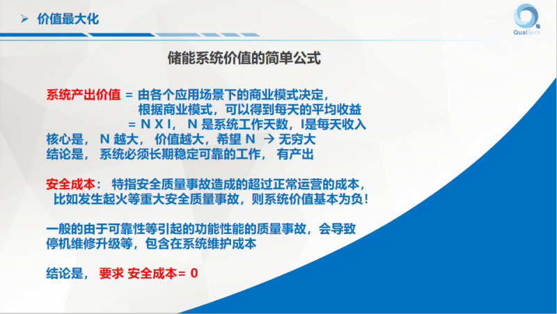 今天重點(diǎn)講的是價(jià)值,儲(chǔ)能系統(tǒng)的價(jià)值=系統(tǒng)持續(xù)產(chǎn)出部分-初始投資-系統(tǒng)運(yùn)營(yíng)成本-安全成本。系統(tǒng)產(chǎn)出價(jià)值可以隨著時(shí)間不斷積累增加。安全成本開始可能不發(fā)生,隨著時(shí)間的推移不斷的累積,直到某一天直接爆發(fā)。運(yùn)營(yíng)成本的大小可以通過我們的努力不斷降低。