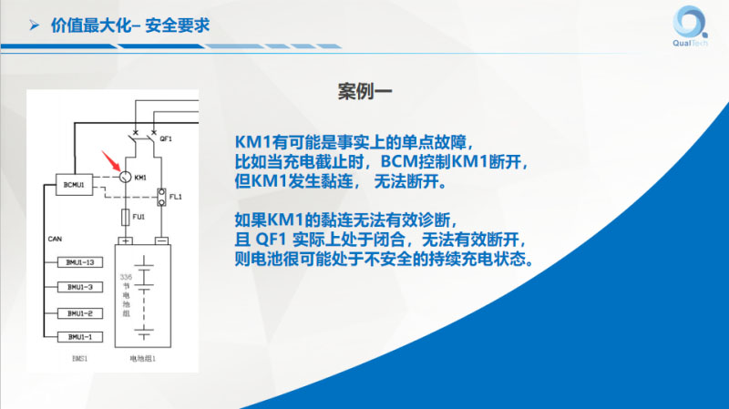 講幾個(gè)簡(jiǎn)單案例,儲(chǔ)能系統(tǒng)里的一個(gè)簇,比如說上面寫著電池,我們看一下KM1繼電器,它可能存在單點(diǎn)故障,BMS充電需要截止,要把繼電器斷開,繼電器不是百分之百斷開,可能粘連了就無法斷開。無法斷開怎么辦?得想辦法知道粘連了,才會(huì)有對(duì)策。有些情況下可能檢測(cè)不出來,這就沒辦法。QF一般是斷路器,斷路器一般不太經(jīng)常的開關(guān),斷路器一般都是處于閉合狀態(tài),當(dāng)QF1一旦粘連,如果沒有辦法診斷,就可能繼續(xù)充電。整個(gè)系統(tǒng)可能有很多,其他的還在充電,這個(gè)簇可能還在繼續(xù)充電,過了一段時(shí)間可能出現(xiàn)過壓的問題,時(shí)間長(zhǎng)了電池就有問題了。