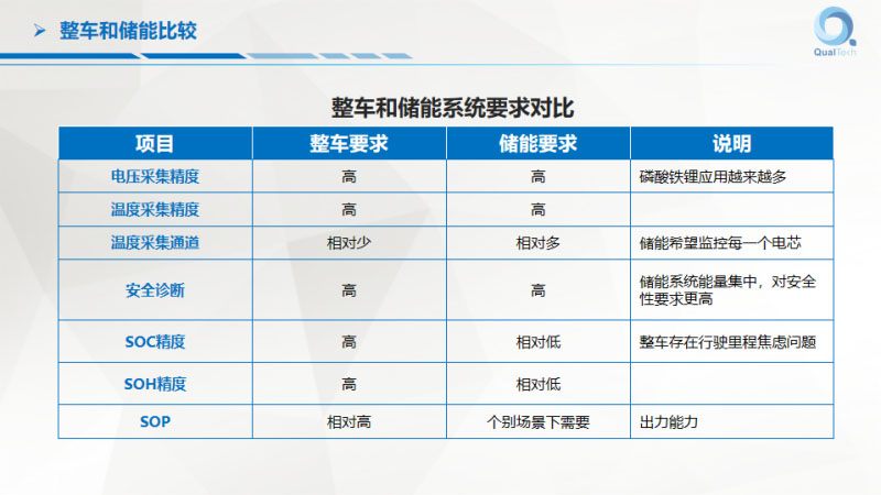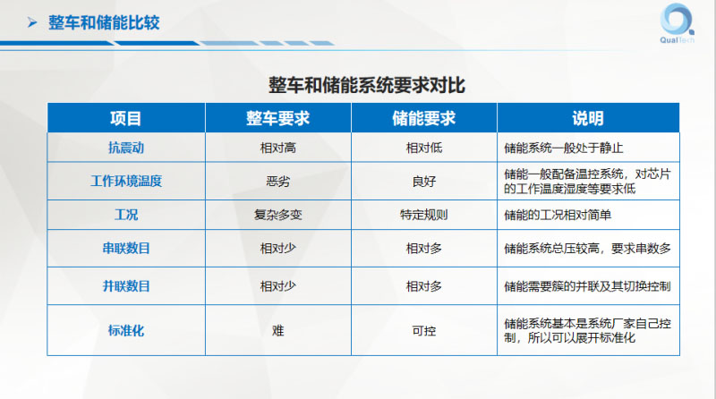 整車的BMS和儲(chǔ)能的BMS到底有什么區(qū)別?本來想在這里多講一下,沒有多少時(shí)間我過一下。整車和儲(chǔ)能相比,我的結(jié)論是儲(chǔ)能的要求跟汽車差不多,后果比汽車更嚴(yán)重,一定要以汽車級(jí)的電池管理進(jìn)行開發(fā),16949和ISO的指導(dǎo)下進(jìn)行儲(chǔ)能系統(tǒng)的設(shè)計(jì),才可以在方法和體系上保障它的安全、可靠的級(jí)別。不是一般的、隨便搞兩下。