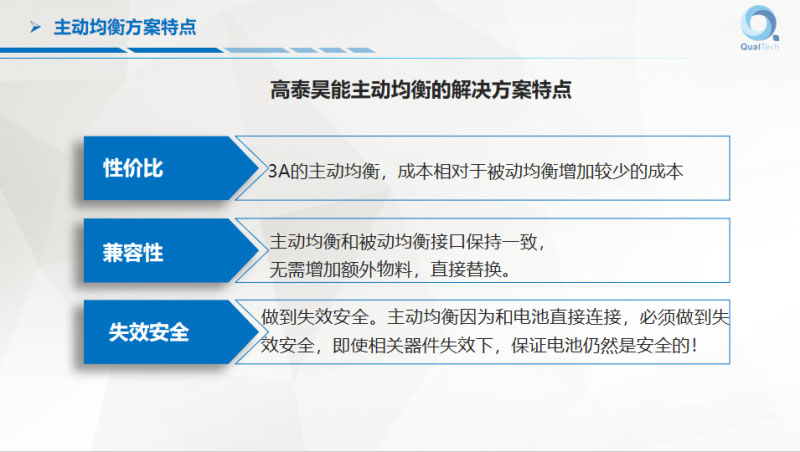 運(yùn)營(yíng)效率今天沒時(shí)間了,包括BMS廠家、包括PCS廠家,大家怎么把這個(gè)系統(tǒng)做得效率高?這是BMS的核心功能(見PPT)、這是我們做的主動(dòng)均衡方案介紹(見PPT),剛才講到失效的分析,我們提供的主動(dòng)均衡解決方案解決了失效安全的問題,我們可以避免剛才說的這些問題,確保在電池端不會(huì)發(fā)生短路。