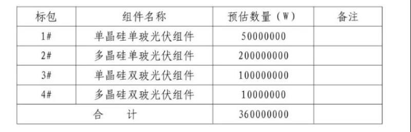 本招標(biāo)項目劃分為四個標(biāo)段,預(yù)估總采購數(shù)量為360MW,其中單晶硅單玻光伏組件50MW,多晶硅單玻光伏組件200MW,單晶硅雙玻光伏組件100MW,多晶硅雙玻光伏組件10MW。潛在投標(biāo)人可以對某一標(biāo)段或全部標(biāo)段進(jìn)行投標(biāo),兼投兼中。