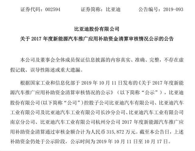 10月15日,比亞迪股份有限公司(下稱“比亞迪”)發(fā)布公告稱,根據(jù)工信部《關(guān)于 2017 年度新能源汽車推廣應(yīng)用補(bǔ)助資金清算審核情況的公示》,比亞迪旗下四家控股子公司2017年度新能源汽車推廣應(yīng)用補(bǔ)助資金清算通過審核金額合計(jì)為人民幣31.58億元。