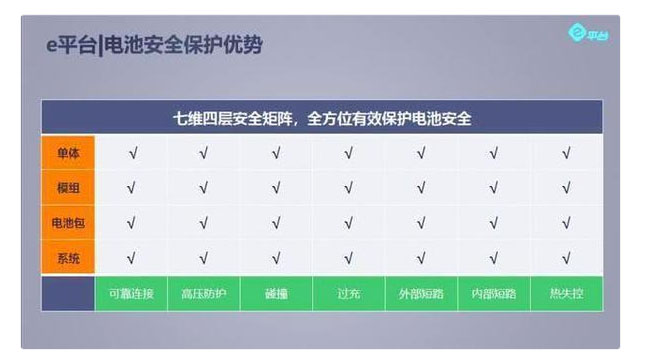 第四層,是模組級(jí)保護(hù)。通過(guò)采用高強(qiáng)度的鋁型材的模組設(shè)計(jì)使電池模組的強(qiáng)度增加了近35%,同時(shí)在電芯與電芯之間、模組與PACK之間設(shè)置隔熱緩沖區(qū),當(dāng)車輛受到擠壓時(shí),盡可能在一定程度上確保電芯不至于受到擠壓,保證電芯使用的安全性。