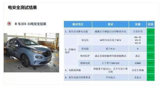 在實(shí)驗(yàn)中,等紅燈的北汽新能源EX3被后車以50km/h時(shí)速追尾,隨后又被正常通過(guò)綠燈的車輛以50km/h時(shí)速撞擊側(cè)面。在后、側(cè)兩次強(qiáng)大的碰撞下,北汽新能源EX3的A柱、B柱,門(mén)梁沒(méi)有出現(xiàn)變形,駕駛艙保持了良好整體性,碰撞中車門(mén)沒(méi)有被撞開(kāi),碰撞后車門(mén)也能正常打開(kāi)。在測(cè)試結(jié)束后公布的數(shù)據(jù)顯示,北汽新能源的電安全測(cè)試結(jié)果全部合格。