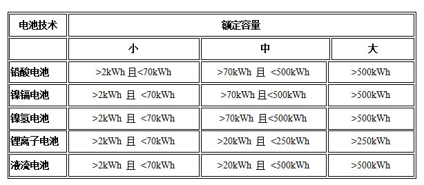 該指南還規(guī)定了不同電池儲能系統(tǒng)類型的額定容量,如下表所示: