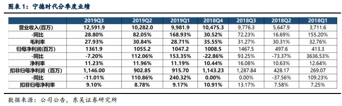 2019Q1-3 凈利潤(rùn) 34.64 億,同比+45.7%,位于業(yè)績(jī)預(yù)告中值偏上,符合預(yù)期:2019 年前三季度公司營(yíng)收 328.56 億元,同比增長(zhǎng) 71.7%;歸母凈利潤(rùn) 34.64 億元,同比增長(zhǎng) 45.65%;扣非凈利潤(rùn) 29.65 億元,同比增長(zhǎng) 49.34%;非經(jīng)常性損益 5 億元,同比增加 27%。2019 年前三季度毛利率為 29.08%,同比下降 2.2 個(gè)百分點(diǎn),凈利率 11.44%,同 比下降 2.37%。