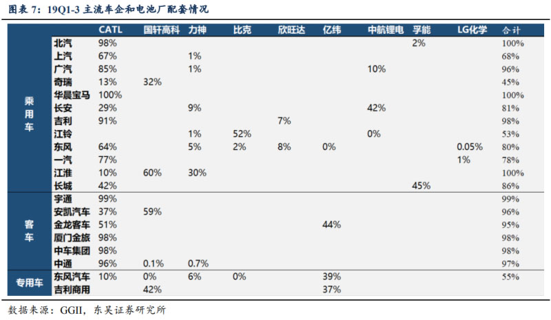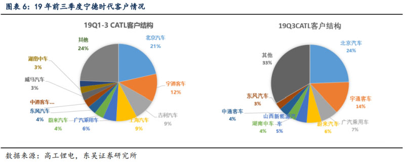 5)寧德時(shí)代基本為主流車企 A 供:從裝機(jī)電量角度看,19 年前三季度公司前五大 客戶為,北汽(4.6gwh,占公司裝機(jī)電量比重 21.5%),宇通(2.51gwh,占 12%),吉 利(1.93gwh,占 9%),上汽(1.88gwh,占 8.8%),廣汽(1.21gwh,占 5.6%)。