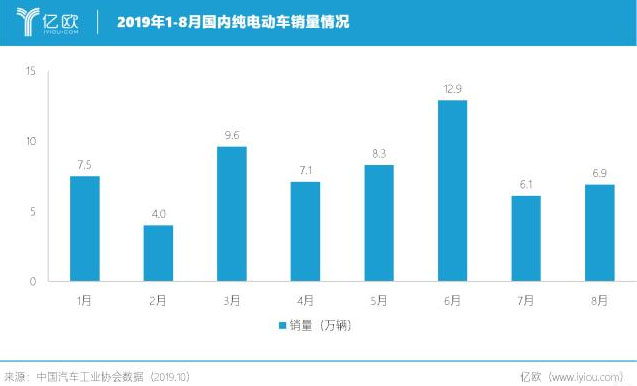 2019年1-8月,國內(nèi)汽車總體銷量為1610.4萬輛,同比下降11%。其中,純電動(dòng)車銷量為62.9萬輛,在7月補(bǔ)貼滑坡后遭遇斷崖式下跌。