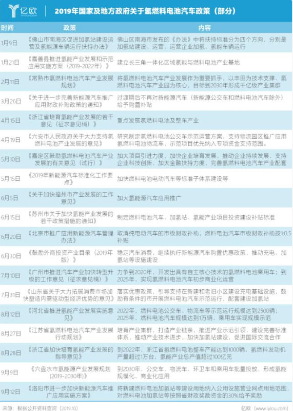 政策支持也是車企加注氫燃料電池汽車的重要原因,2019年以來,全國各地氫燃料電池汽車政策經(jīng)億歐汽車整理如下。