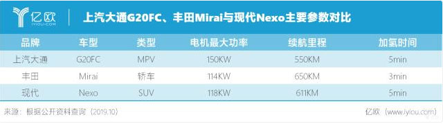 2019年上海車展上,上汽大通氫燃料電池乘用車G20FC亮相,其電機(jī)最高功率達(dá)150 kw,可實(shí)現(xiàn)5分鐘內(nèi)加氫和零下30℃冷啟動(dòng),NEDC綜合工況續(xù)航里程高達(dá)550km,各項(xiàng)參數(shù)不輸日韓主流競品。