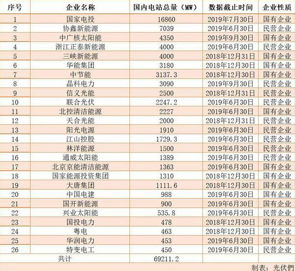 本文統(tǒng)計(jì)了26家光伏投資企業(yè)的裝機(jī)規(guī)模,包括14家國(guó)有企業(yè)及12家民營(yíng)企業(yè)。26家光伏企業(yè)在國(guó)內(nèi)持有光伏電站的總規(guī)模為69.2GW,占目前全國(guó)光伏電站累計(jì)裝機(jī)規(guī)模的36.4%。