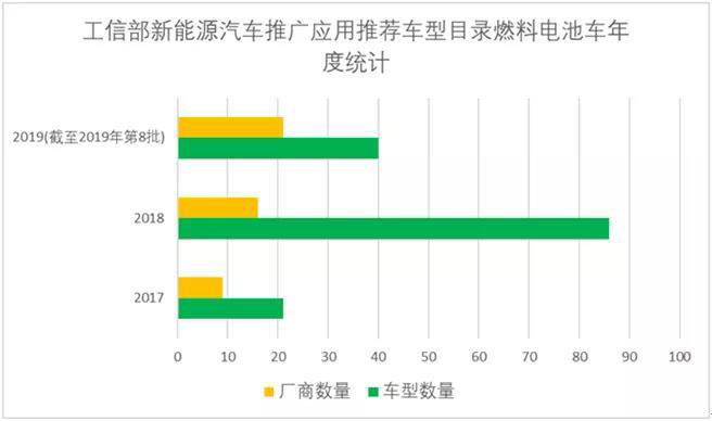 與此形成鮮明對比的是,燃料電池車在通知中被單獨對待,補(bǔ)貼并未一同調(diào)整,近期關(guān)注度頗高。多個地方政府出臺氫燃料電池車發(fā)展規(guī)劃,相關(guān)產(chǎn)業(yè)集聚效果逐漸顯現(xiàn)。而出現(xiàn)在工信部《新能源汽車推廣應(yīng)用推薦車型目錄》中的燃料電池車型號數(shù)量從2017年21款快速上升到2018年86款,2019年僅第6、第7和第8批就公示18個廠商的28款燃料電池車。
