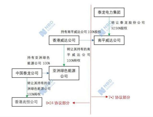 據(jù)前述《判決書》和葉躍松向《每日經(jīng)濟新聞》記者提供的8·24協(xié)議掃描件,8·24協(xié)議的4.3(3)條款有如此約定:“于簽訂本協(xié)議的同時,泰龍電力集團、廈門漢銀公司須與買方(或其指明的公司或人士)各簽訂一份股權(quán)轉(zhuǎn)讓協(xié)議,泰龍電力集團、廈門漢銀公司同意轉(zhuǎn)讓其持有的泰龍股份公司92.56%、1.18%股權(quán)給買方(或其指明的公司或人士);同時,威達(香港)能源開發(fā)有限公司(以下簡稱香港威達公司)須與買方(或其指明的公司或人士)簽訂一份股權(quán)轉(zhuǎn)讓協(xié)議,香港威達公司同意轉(zhuǎn)讓其持有的南平威達公司100%股權(quán)給買方(或其指明的公司或人士)?!?