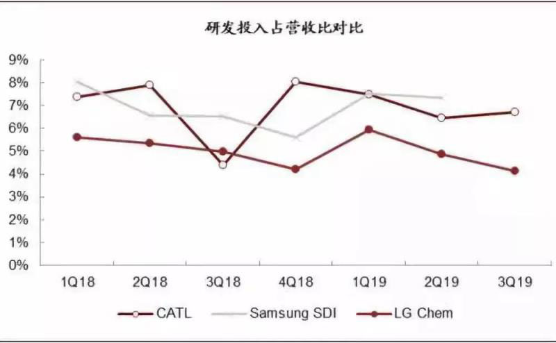 電池業(yè)務(wù)研發(fā)投入占營收比重上,CATL高于三星SDI與LG Chem