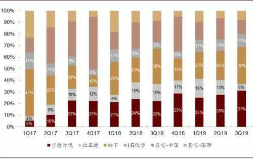 三季度全球動(dòng)力電池裝機(jī)約24.7GWh,松下、CATL、LG Chem、BYD分別占32%、31%、11%、6%,多寡頭格局穩(wěn)固。細(xì)分來看LG Chem份額提升較快,超越比亞迪,而三星SDI在總量上較低。