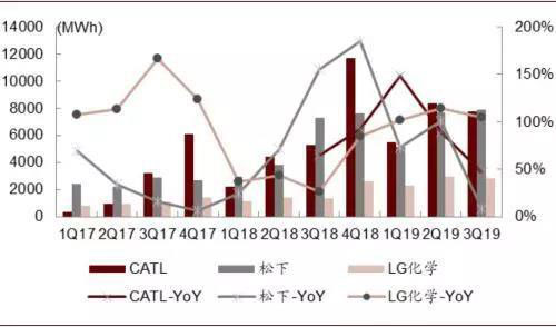 全球主要?jiǎng)恿﹄姵仄髽I(yè)裝機(jī)量對比,1-3Q松下與CATL相近,LG Chem快速增長