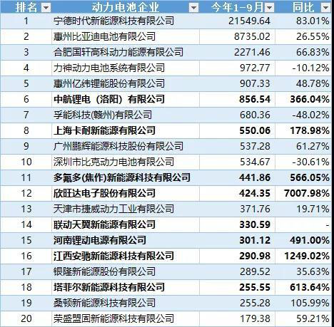 2019年前三季度動(dòng)力電池裝機(jī)量TOP20