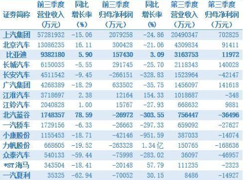 若單看第三季度,車(chē)企經(jīng)營(yíng)狀況更差,凈虧損企業(yè)數(shù)高達(dá)9家,占所統(tǒng)計(jì)車(chē)企的60%,還能實(shí)現(xiàn)盈利的幾乎均為行業(yè)龍頭如上汽集團(tuán)、北京汽車(chē)(港股01958)、比亞迪、長(zhǎng)城汽車(chē)(港股02333)、廣汽集團(tuán)(港股02238)。