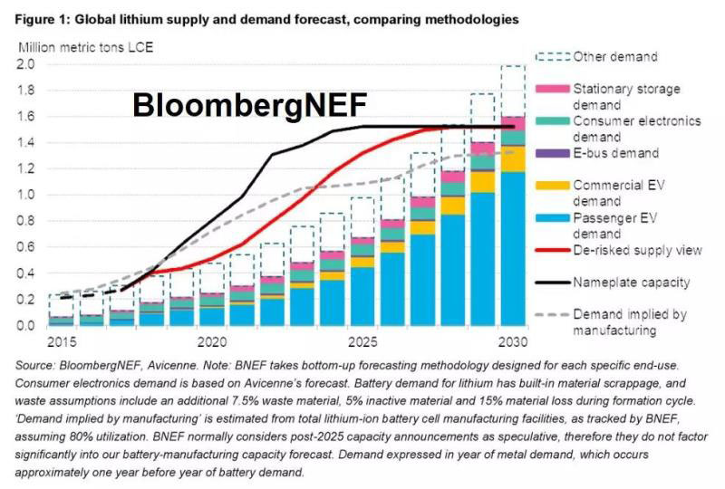 注:BNEF采用針對每種特定用途分別設(shè)計的自下而上的預(yù)測方法學(xué)。圖中,消費電子產(chǎn)品的需求是基于Avicenne的預(yù)測。鋰電池的鋰需求已包含廢料率:在成型周期中,假設(shè)廢料包括廢棄材料7.5%、惰性材料5%和材料損失15%。假設(shè)制造利用率為80%,BNEF跟蹤鋰離子電池廠商的總產(chǎn)量,估算得出由產(chǎn)量倒推的需求。BNEF認(rèn)為計劃在2025年以后上線的產(chǎn)能公告具有投機性,因此這類公告對我們的電池制造產(chǎn)能預(yù)測影響不大。需求以金屬需求的年份表示,大約比電池需求早一年出現(xiàn)。