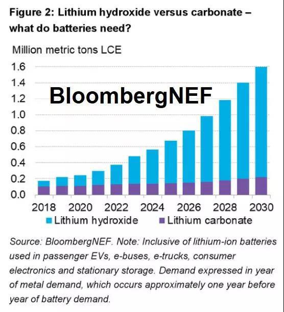 市場對鋰需求預(yù)測的差異,也在于各方對氫氧化鋰和碳酸鋰的比例看法不同。根據(jù)自下而上的預(yù)測方法,BNEF預(yù)測高鎳正極材料使用率將逐漸上升,特別是用于新能源乘用車的電池,促使氫氧化鋰的需求增長快于碳酸鋰。到2030年,電池級氫氧化鋰的需求可能近140萬噸LCE,而碳酸鋰的需求將達(dá)21.8萬噸LCE。詳情請參考下圖。