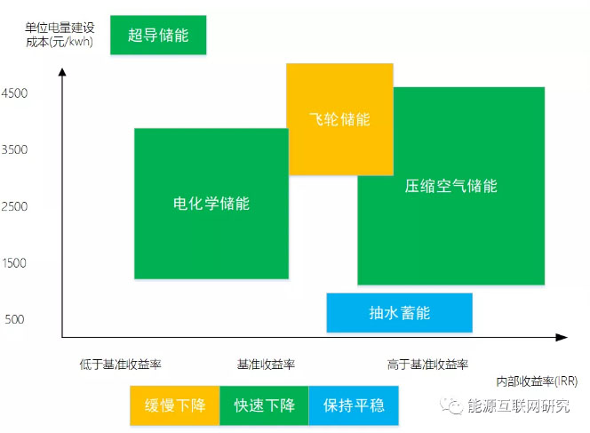 可見,從國(guó)民經(jīng)濟(jì)評(píng)價(jià)角度,電網(wǎng)側(cè)儲(chǔ)能具有良好的外部性,針對(duì)具體的電網(wǎng)側(cè)儲(chǔ)能項(xiàng)目,可設(shè)定假定參數(shù),開展面向電力系統(tǒng)效益的財(cái)務(wù)分析,為電網(wǎng)側(cè)儲(chǔ)能投資、建設(shè)、可持續(xù)發(fā)展路徑以及市場(chǎng)化機(jī)制和政策的建立提供參考?;陔娏ο到y(tǒng)效益的電網(wǎng)側(cè)儲(chǔ)能成本主要包括建設(shè)成本、安裝成本、運(yùn)行維護(hù)成本、更新改造成本。電網(wǎng)側(cè)儲(chǔ)能在電力系統(tǒng)中的收益主要包括、提升電網(wǎng)利用效率、提高供電可靠性、節(jié)能收益、減排收益、延緩裝機(jī)總量收益、應(yīng)急供電收益、參與電力市場(chǎng)輔助服務(wù)收益等。根據(jù)基于電力系統(tǒng)效益的電網(wǎng)側(cè)儲(chǔ)能成本和收益分析,利用項(xiàng)目財(cái)務(wù)分析方法和模型,對(duì)相同邊界條件下各類電網(wǎng)側(cè)儲(chǔ)能經(jīng)濟(jì)性進(jìn)行評(píng)價(jià),定性得到其各類項(xiàng)目經(jīng)濟(jì)性結(jié)果和內(nèi)部收益率范圍,如下圖所示。