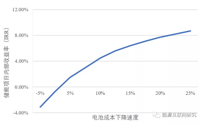 電池成本下降速度對(duì)內(nèi)部收益率的影響如下圖所示。