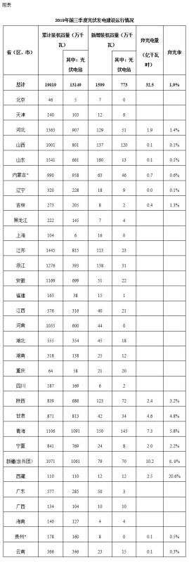 2019年1-9月,平均利用小時數(shù)較高的省份是云南(2148小時)、四川(1936小時)。2019年1-9月,棄風仍較為嚴重的地區(qū)是新疆(棄風率15.4%、棄風電量57.9億千瓦時)、甘肅(棄風率8.9%、棄風電量16.9億千瓦時)、內(nèi)蒙古(棄風率6.6%、棄風電量32.0億千瓦時)。