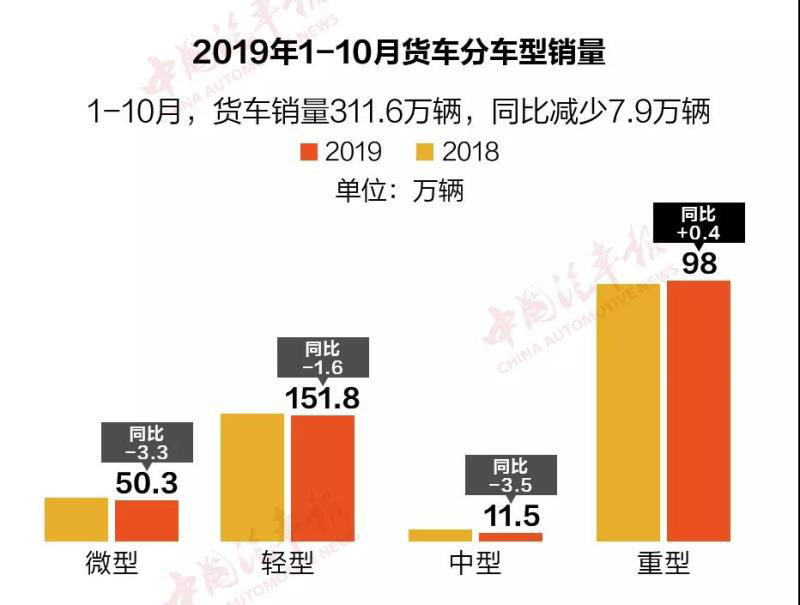 10月整體汽車銷量繼續(xù)下滑,同比下降4%,在車市寒冬中,商用車回暖態(tài)勢明顯,在各地加快更新淘汰及投資拉動等因素的影響下,本月商用車繼續(xù)保持較好的增長勢頭,漲幅與9月相比有擴大的趨勢。