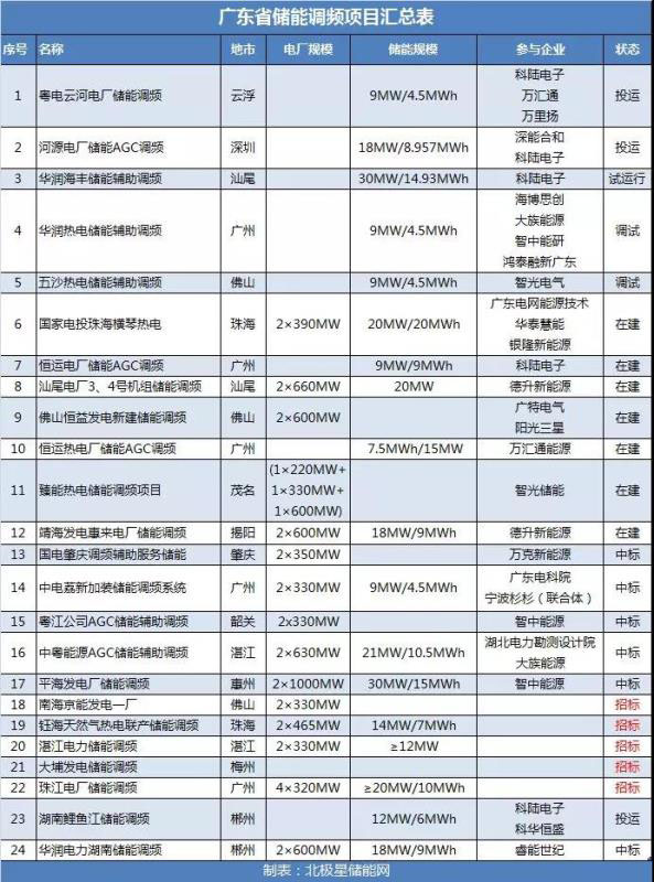 自2018年9月1日期,《廣東調(diào)頻輔助服務(wù)市場(chǎng)交易規(guī)則(試行)》執(zhí)行以來(lái),廣東儲(chǔ)能調(diào)頻市場(chǎng)發(fā)展火熱,到目前為止招標(biāo)、在建及投運(yùn)的儲(chǔ)能調(diào)頻項(xiàng)目已有20余個(gè)。如圖所示: