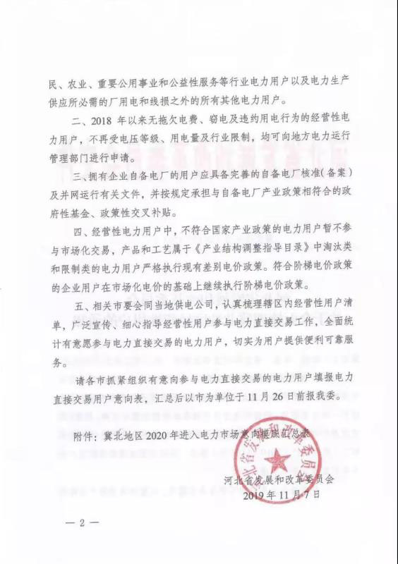 11月7日河北發(fā)改委下發(fā)文件稱全面梳理冀北地區(qū)經(jīng)營性電力用戶,對冀北地區(qū)尚未準入且自愿參加市場的企業(yè)進行全面摸底。經(jīng)營性電力用戶不再受電壓等級、用電量及行業(yè)限制,均可向地方電力運行管理部門進行申請。這意味著冀北也即將全面放開經(jīng)營性電力用戶參與電力市場化交易。