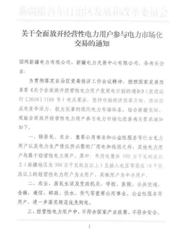 11月3日新疆自治區(qū)發(fā)改委發(fā)布了《關(guān)于全面放開經(jīng)營性電力用戶參與電力市場化交易的通知》,稱除居民、農(nóng)業(yè)、重要公用事業(yè)和公益性服務(wù)等行業(yè)電力用戶以及電力生產(chǎn)供應(yīng)所必需的廠用電和線損之外,其他電力均屬于經(jīng)營性電力用戶。其中:年用電量在500萬千瓦時及以上(南疆地區(qū)為300萬千瓦時及以上)且接入電壓等級在10千伏及以上的經(jīng)營性電力用戶為大用戶,其他用戶為中小用戶。中小用戶可通過售電公司代理后參加電力市場化交易。