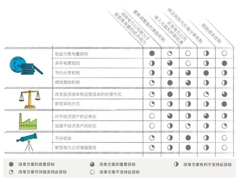 在目前正在進(jìn)行的電力企業(yè)商業(yè)模式改革中,我們看到上述多項(xiàng)改革方案往往不是單一執(zhí)行的,很多綜合性的改革都是選擇多項(xiàng)方案并舉以強(qiáng)化改革效果。例如英國的RIIO(收入=獎(jiǎng)勵(lì)+創(chuàng)新+產(chǎn)出)模式中就同時(shí)采用了績效激勵(lì)、多年電費(fèi)規(guī)劃和節(jié)約分享機(jī)制等多項(xiàng)措施。因此,監(jiān)管者和企業(yè)可以根據(jù)設(shè)定的規(guī)劃目標(biāo),合理地選擇和組合各類改革工具。(參見圖表)