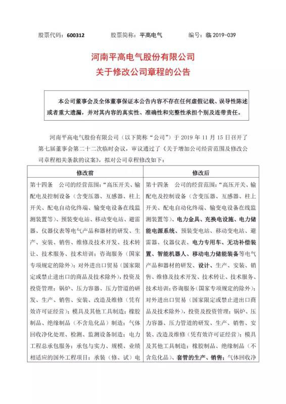 中國儲能網訊:11月15日晚間,平高電氣發(fā)布公告,公司董事會于當日審議通過了《關于增加公司經營范圍及修改公司章程相關條款的議案》,增加的營業(yè)范圍包括電力儲能電源系統(tǒng)、智能機器人和移動電力儲能裝備等項。