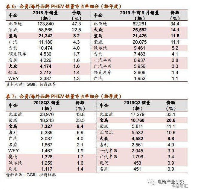 從車(chē)企角度看,在中國(guó)PHEV市場(chǎng)中,前3季度合資品牌市占率達(dá)到42%,較2018年提升26個(gè)百分點(diǎn),其中Q2和Q3分別為49.9%和49.4%。
