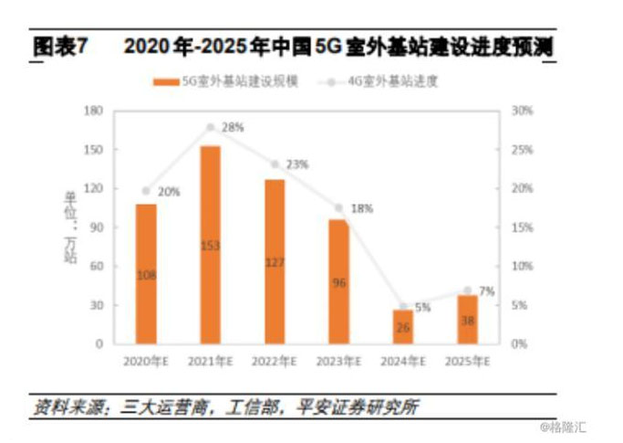 另外,按照5G室外基站覆蓋半徑大約是4G室外基站的一半,5G室外基站數(shù)目至少是現(xiàn)有4G室外基站的2倍來算,根據(jù)平安證券預(yù)計(jì),中國電信至少需要200萬站5G室外基站,中國移動至少需要360萬站5G室外基站,中國聯(lián)通至少需要180萬站 5G 室外基站。