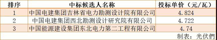 11月26日,中廣核吉林白城光伏(100MW)領(lǐng)跑激勵(lì)1號(hào)項(xiàng)目設(shè)計(jì)施工總承包工程公示中標(biāo)候選人。根據(jù)公示內(nèi)容,中國(guó)電建集團(tuán)吉林省電力勘測(cè)設(shè)計(jì)院有限公司以單價(jià)4.824元/瓦位列第一中標(biāo)候選人,詳情如下: