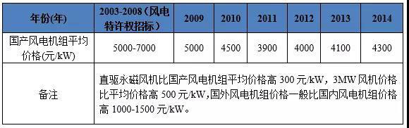 2003-2014年國內(nèi)風(fēng)電機(jī)組平均價(jià)格(來源:計(jì)鵬咨詢)