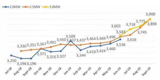 2019年以來,各機(jī)組投標(biāo)均價(jià)持續(xù)回升,且增幅不斷擴(kuò)大。2019年9月,2.5MW級(jí)別機(jī)組的投標(biāo)均價(jià)為3898元/千瓦,比去年8月份的價(jià)格低點(diǎn)回升17%;2019年第三季度,3.0MW級(jí)別機(jī)組的投標(biāo)均價(jià)均在3700元以上,9月達(dá)3900元/千瓦。