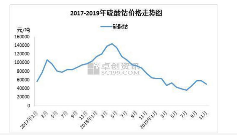10月份三元正極材料廠商開工疲軟,出貨情況不佳,部分企業(yè)簽單出貨出現(xiàn)較大幅度下降。正極材料市場增量難尋,并且動力電池需求持續(xù)疲軟,同比情況均為下降。鈷及其化合物市場價(jià)格持穩(wěn)后進(jìn)入下行通道。硫酸鈷市場主流成交跌至55000元/噸附近,需求端萎靡極大影響了采購信心,實(shí)際采購價(jià)格集中于55000-59000元/噸。