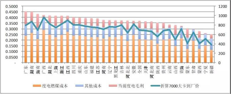 扣除不具有代表性的海南、上海、云南、四川、青海以外,電力需求旺盛的廣東、湖南、煤炭資源豐富的陜西、山西、蒙東、河北北部標(biāo)桿電價具有較超過全國平均值以上的下調(diào)空間,相比,電價較低的新疆、寧夏、甘肅等地和煤電到廠價較高的江西、廣西、安徽等地在現(xiàn)有格局中電價下降空間所剩無幾。