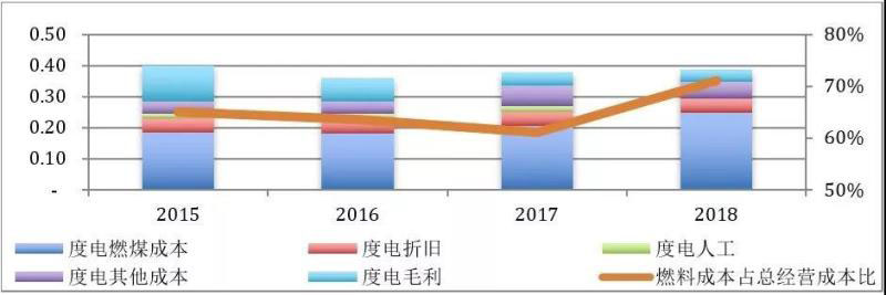 從底線來看,以全國火電裝機最大的華能國際為例,從利潤表折算,2018年度電燃煤成本(不含稅)大約為0.25元/kwh,其他如人工、折舊等成本合計約為0.1元/kwh。