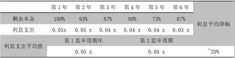 利息支出是輸配電項目的第二大支出項目。假設(shè)第一成本監(jiān)審周期起點時剩余還款年限為15年,等額本金方式還款,由于持續(xù)償還本金,報表收縮,相同貸款利率情況下,第二監(jiān)管周期內(nèi)利息支出降幅可達(dá)20%,由于利息支出在總成本中的占比逐年下降,以20%的成本占比來初步匡算,在總成本下降上可貢獻(xiàn)約4%的幅度。