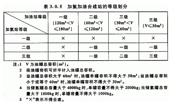 在建站標準方面,目前油氫合建站能夠依據(jù)的僅有2010年制定的《加氫站技術規(guī)范GB50516-2010》(后有推出《加氫站安全技術規(guī)范》GB/T34584-2017,但非強制性國家標準),其中3.0.1規(guī)定,加氫站可與天然氣加氣站或加油站聯(lián)合建站(等級劃分如下圖);3.0.9規(guī)定,加氫加油合建站、加氫加氣合建站中的加油、加氣設施的設計、施工,應符合現(xiàn)行國家標準《汽車加油加氣站設計與施工規(guī)范》GB50156的有關規(guī)定。