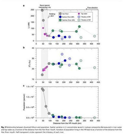 研究團(tuán)隊(duì)在韓國首爾最大的自來水來源地漢江流域取樣,發(fā)現(xiàn)漢江上游的鋰濃度比世界其他河流低,但隨著河流穿過城市和人口密度的增加,鋰濃度比上游高出600%。Hye-Bin Choi等人認(rèn)為,人類活動(dòng)是造成這種變化的原因。